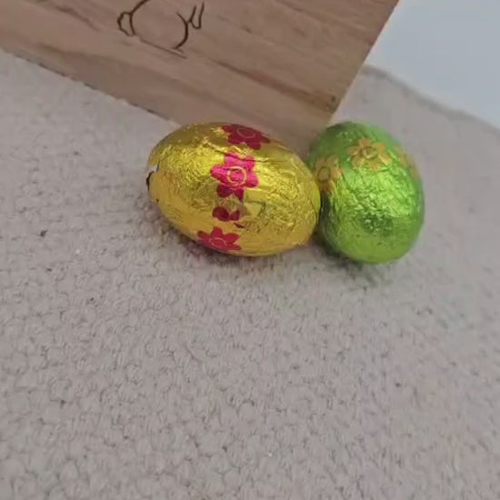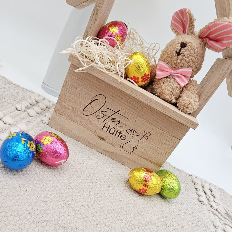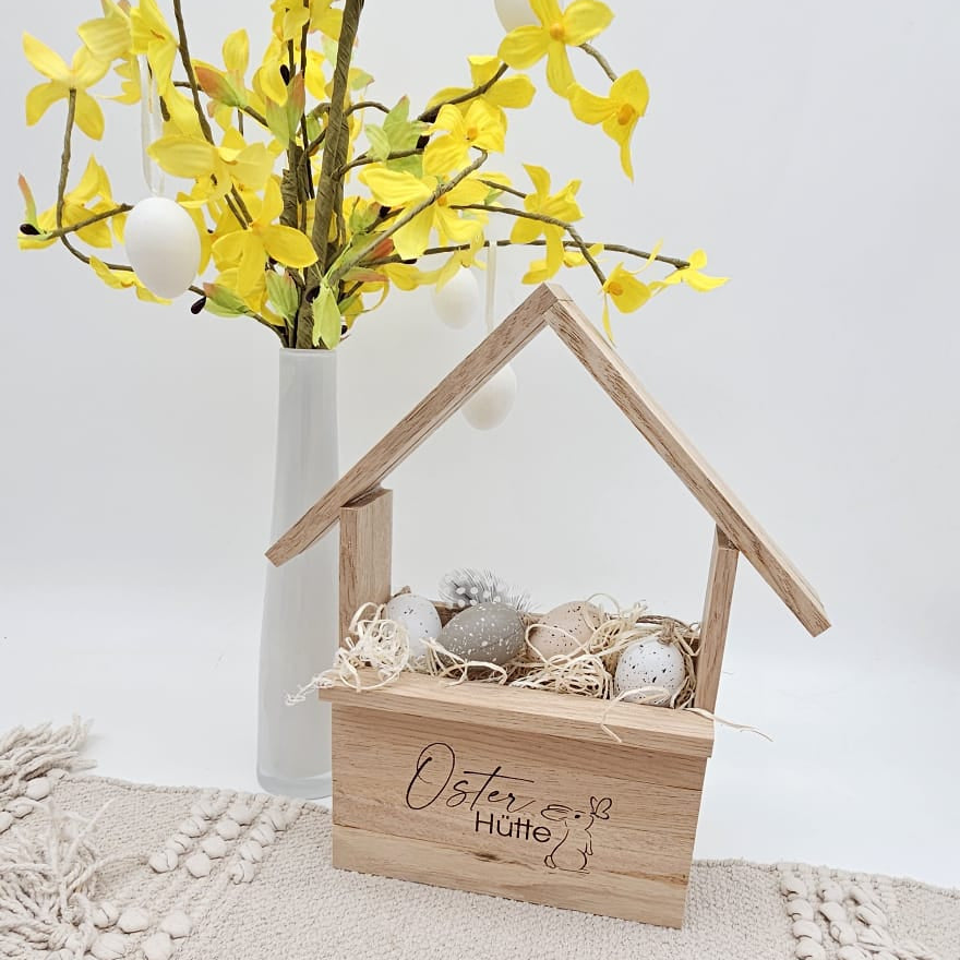 -Beschriftung: Lasergravur „Osterhütte“ mit Hasenmotiv