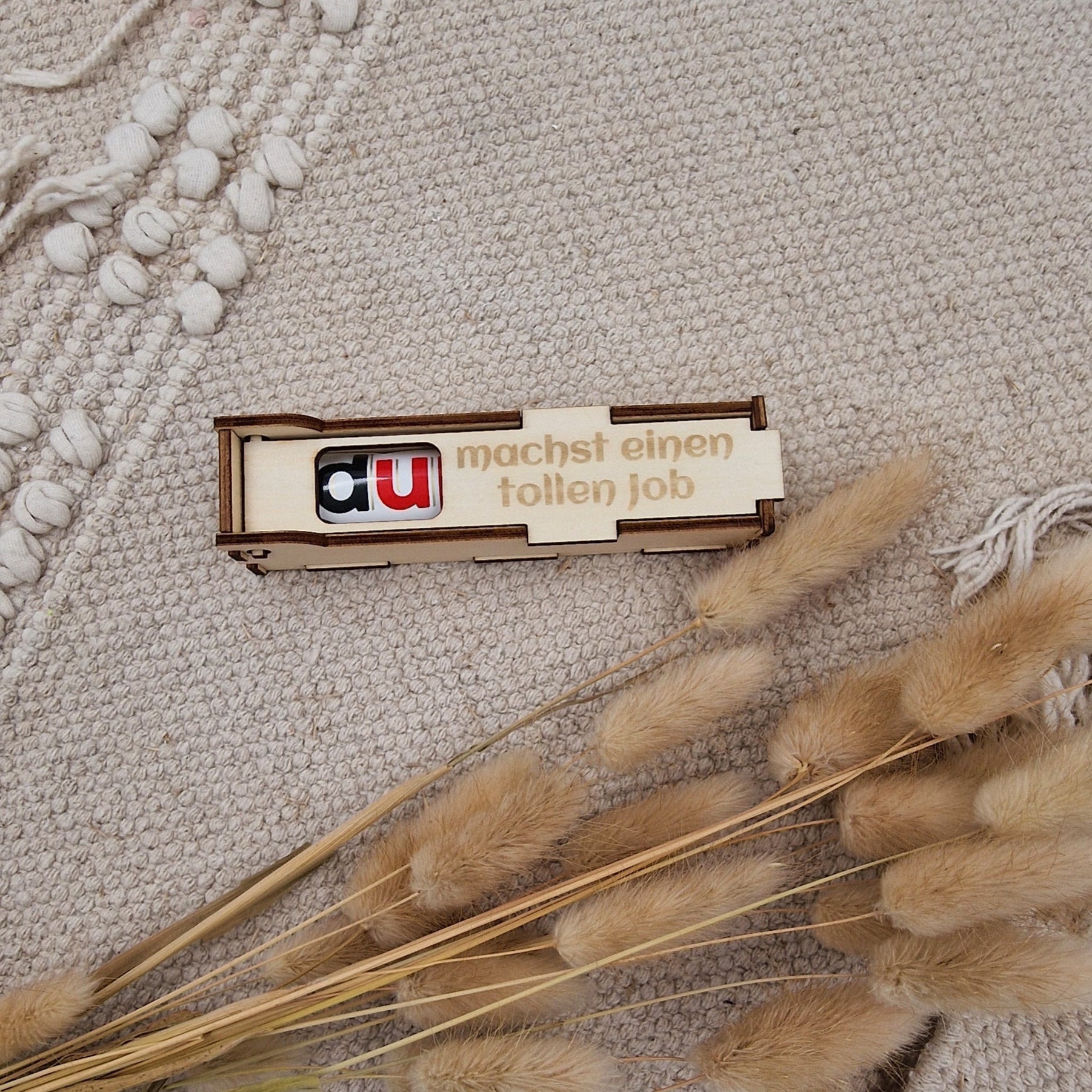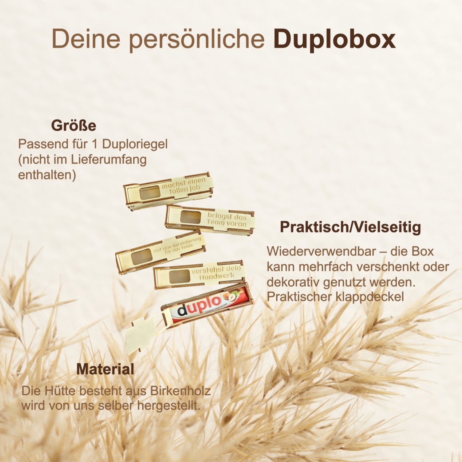 Unsere handgefertigte Duplo-Box aus Holz mit Gravur ist das perfekte Geschenk, um „Danke“ zu sagen oder Wertschätzung im Arbeitsalltag auszudrücken.