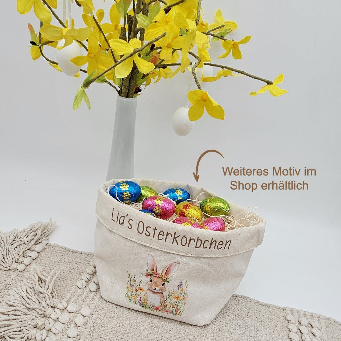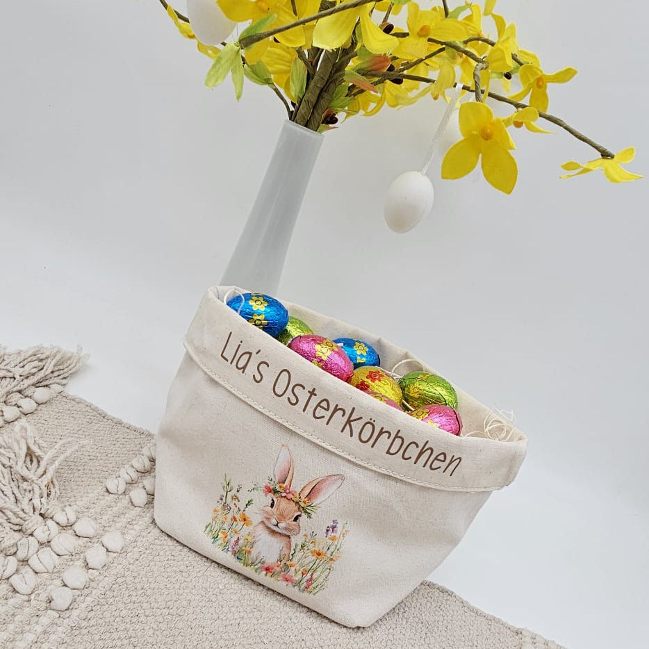 Dieses liebevoll gestaltete personalisierte Osterkörbchen aus Stoff ist der perfekte Begleiter für das Osterfest.