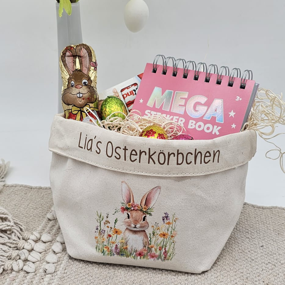 Mit dem süßen Aquarell-Hasenmotiv und dem Wunschnamen wird jedes Körbchen zu einem ganz besonderen Unikat – ideal zum Befüllen mit Ostereiern, kleinen Geschenken oder Süßigkeiten.