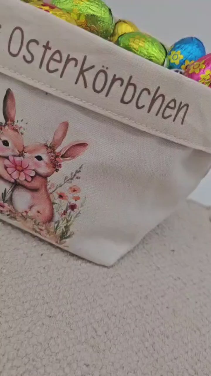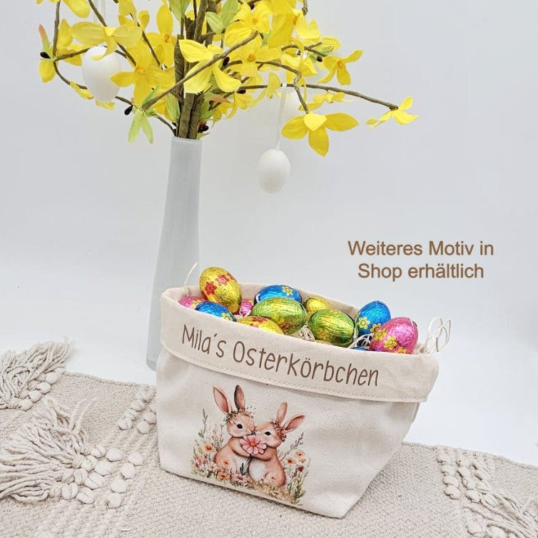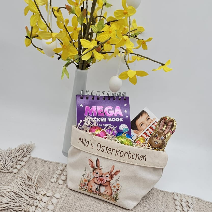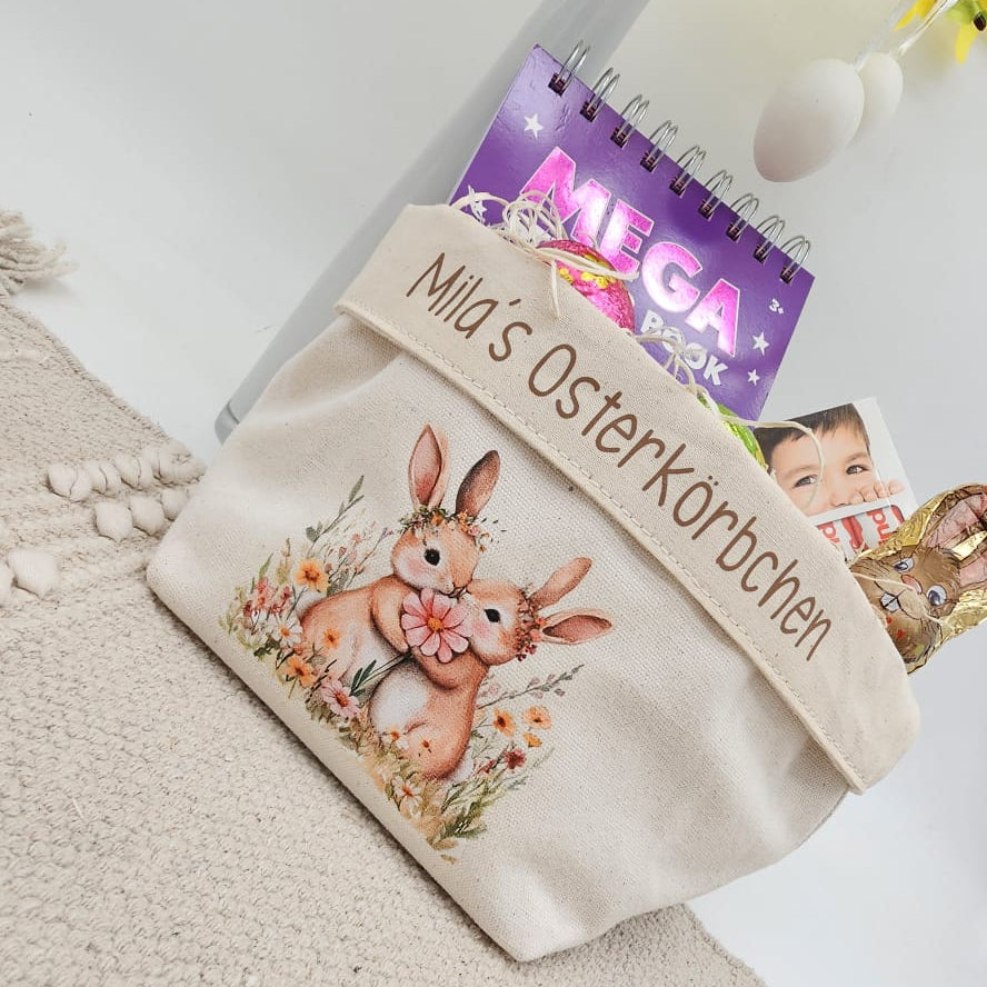 Das Körbchen ist mit einem süßen Hasenmotiv bedruckt und wird mit dem Wunschnamen personalisiert – perfekt zum Befüllen mit Ostereiern, Süßigkeiten oder kleinen Geschenken.
