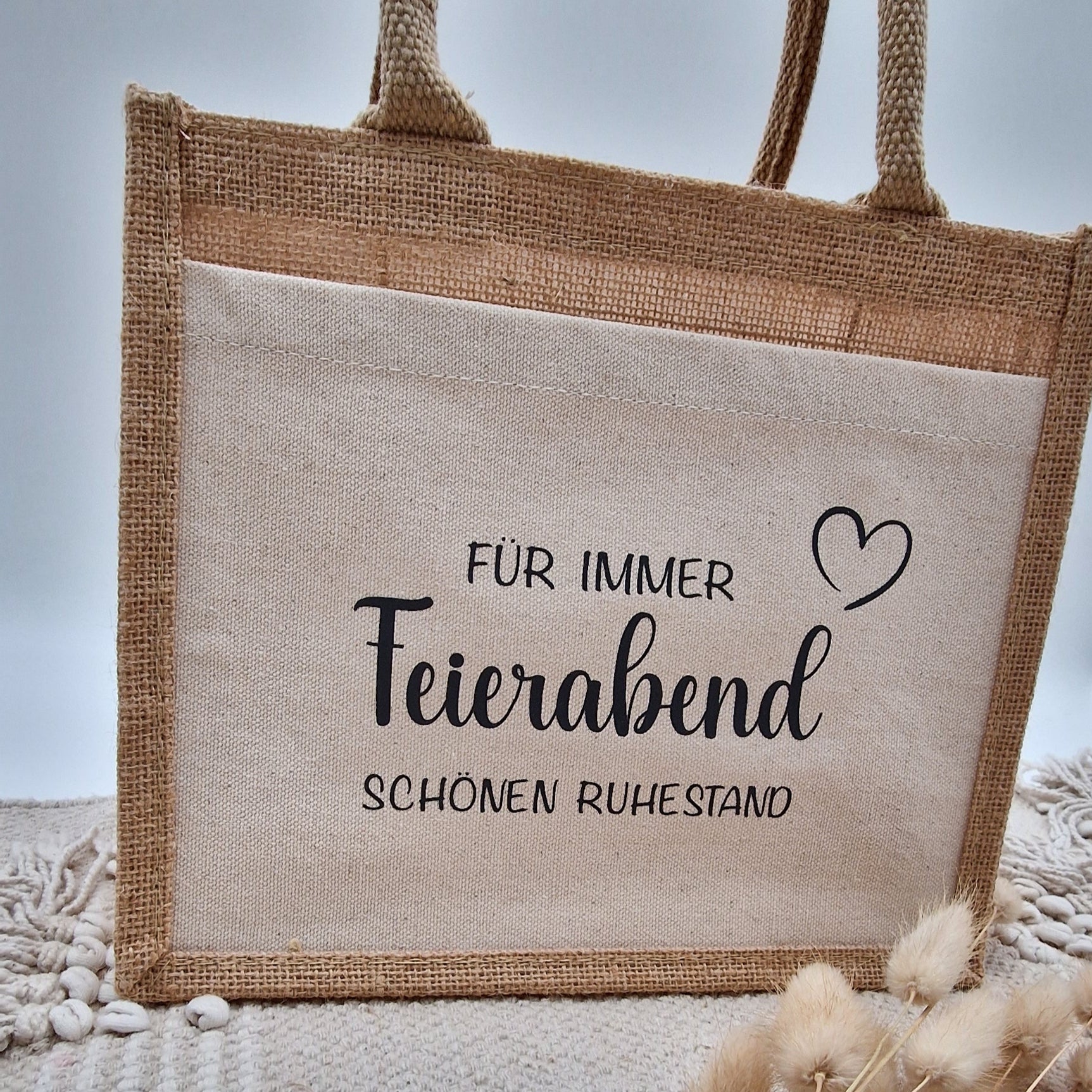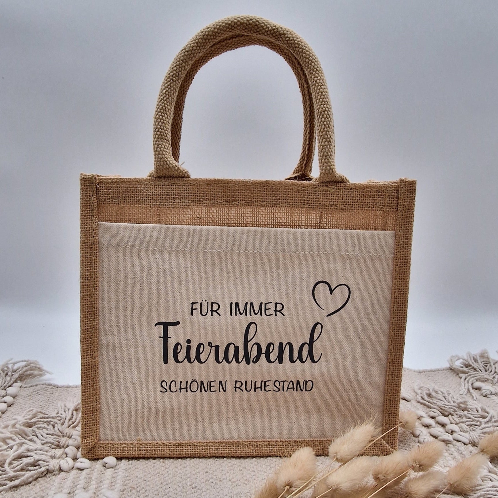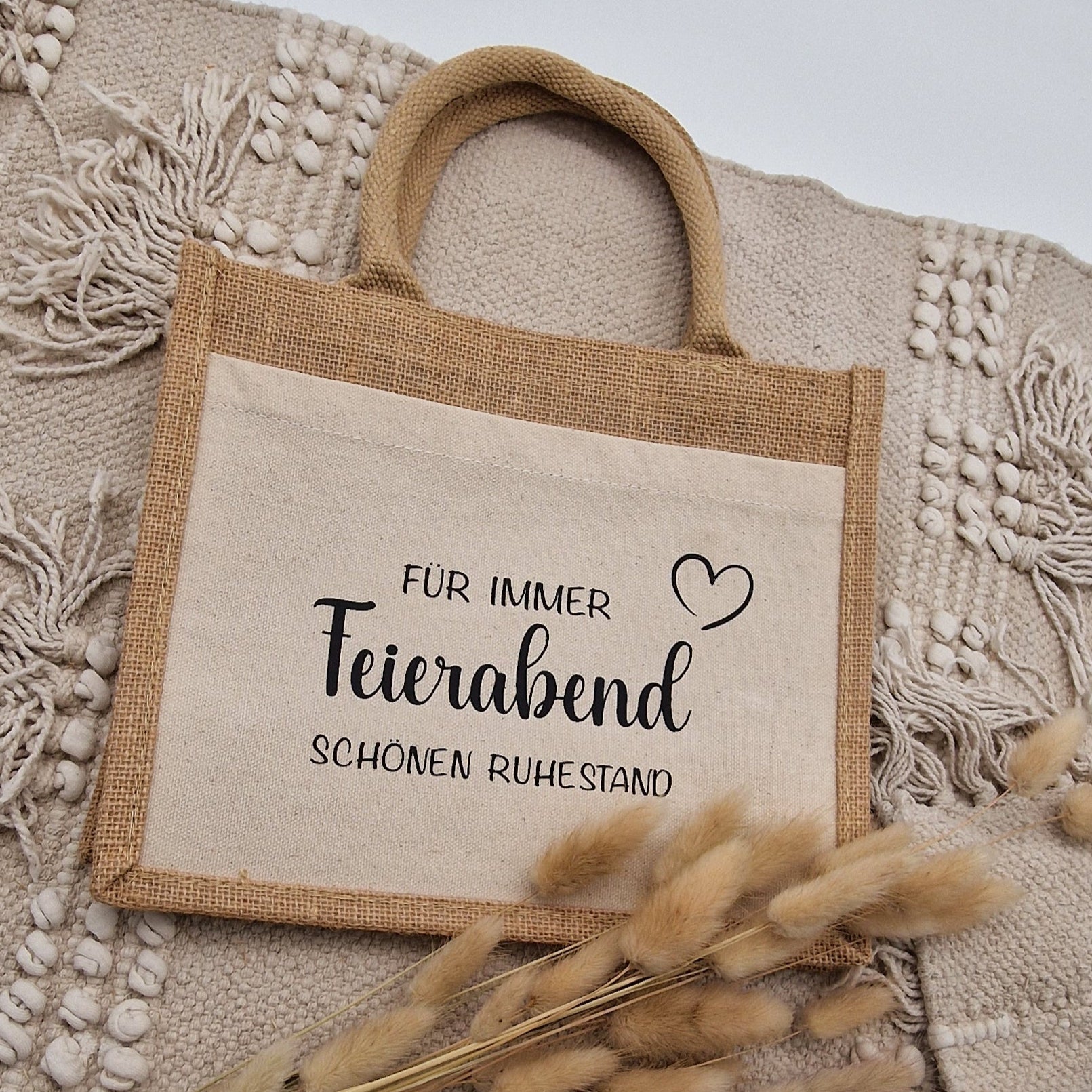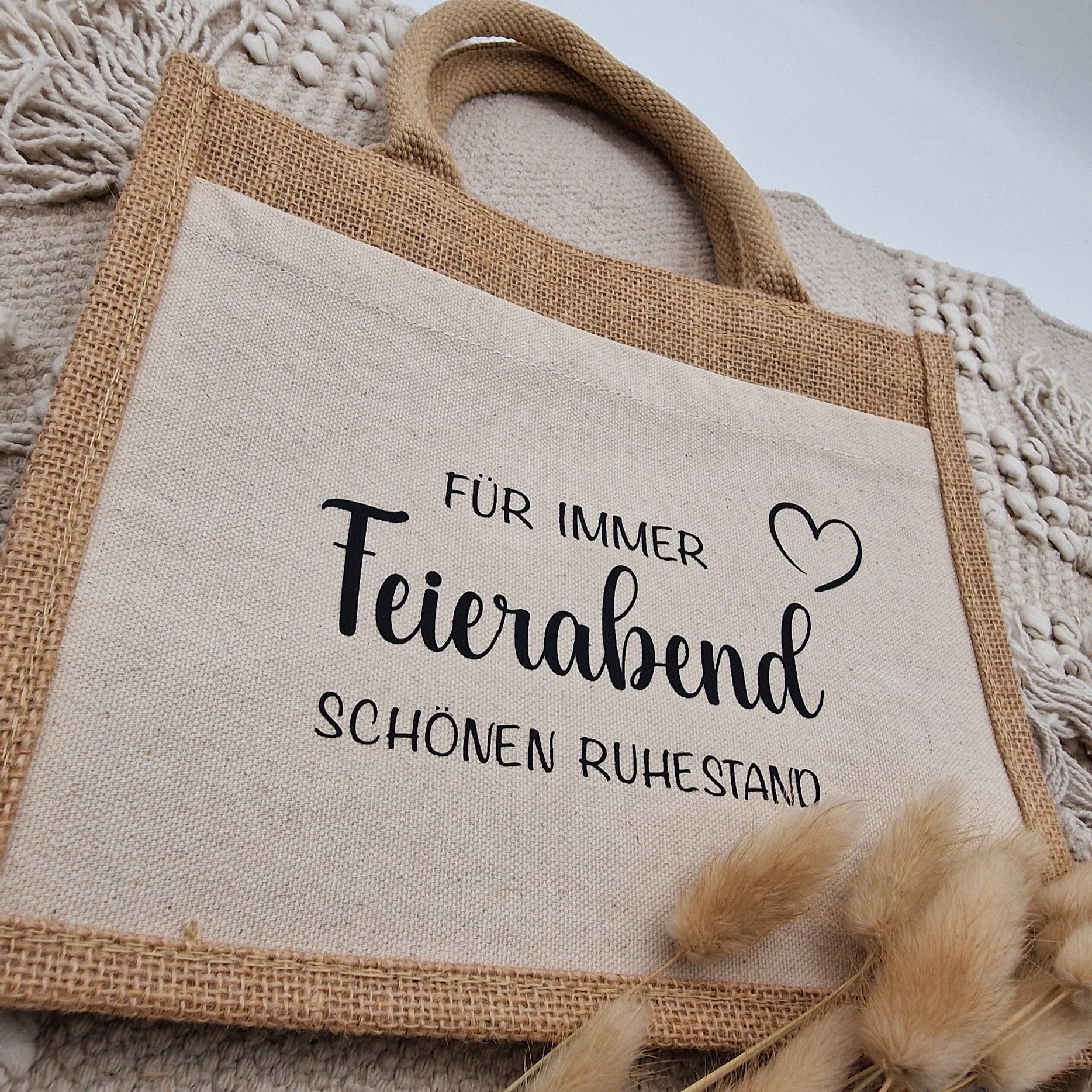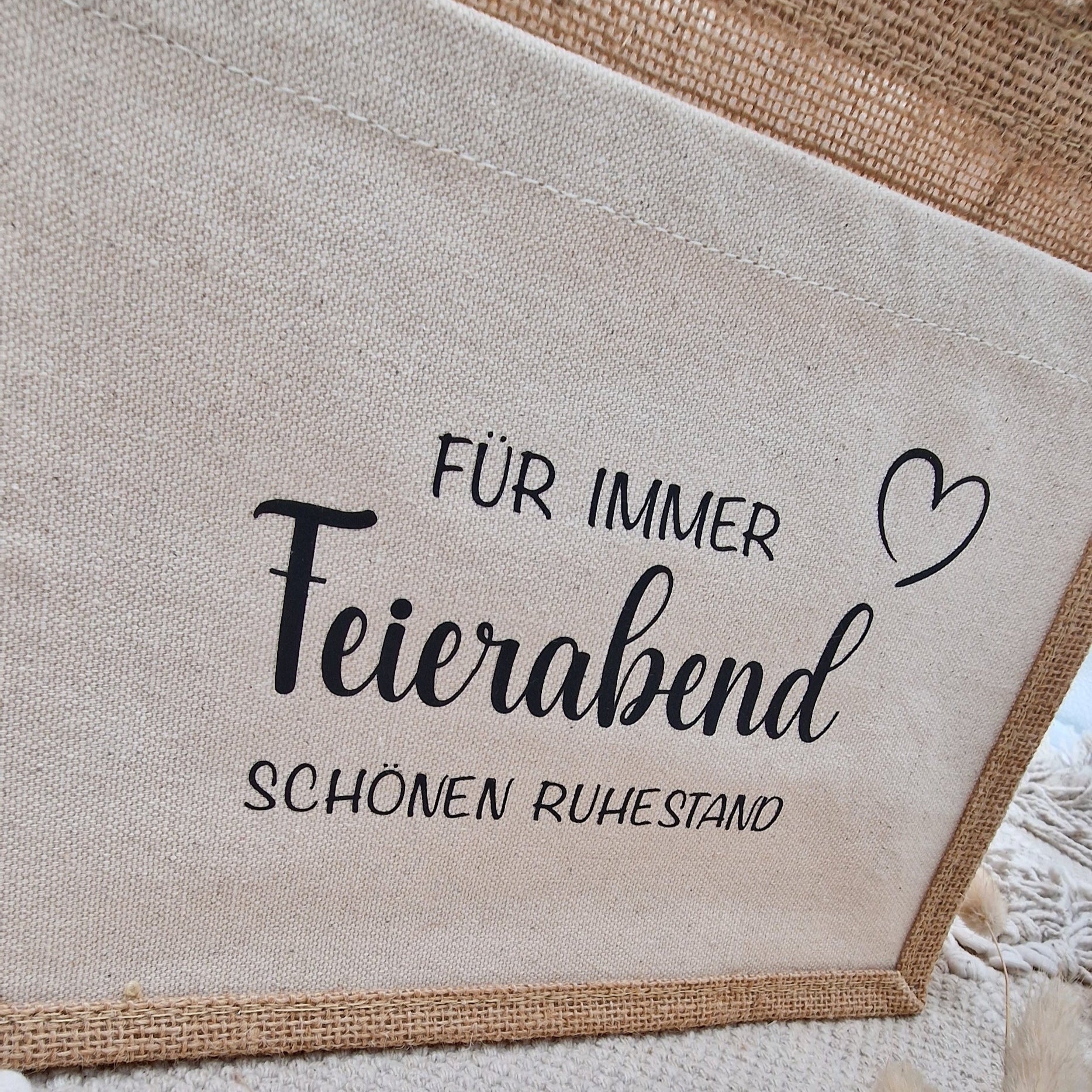 -Die Tasche wird von uns mit dem Spruch Für immer Feierabend schönen Ruhestand sowie ein Herz und wenn gewünscht deinen Wunschnamen bedruckt.