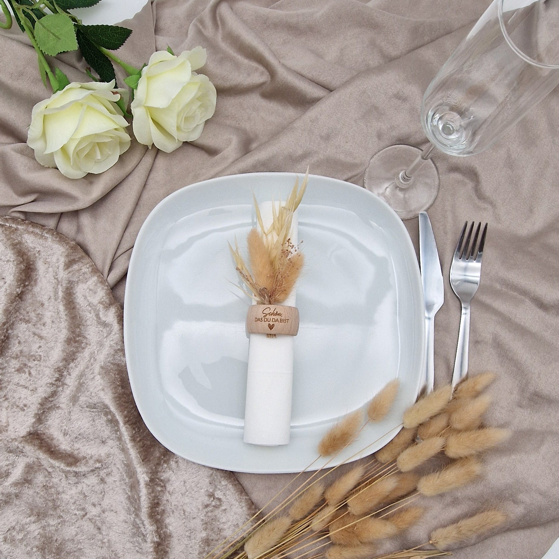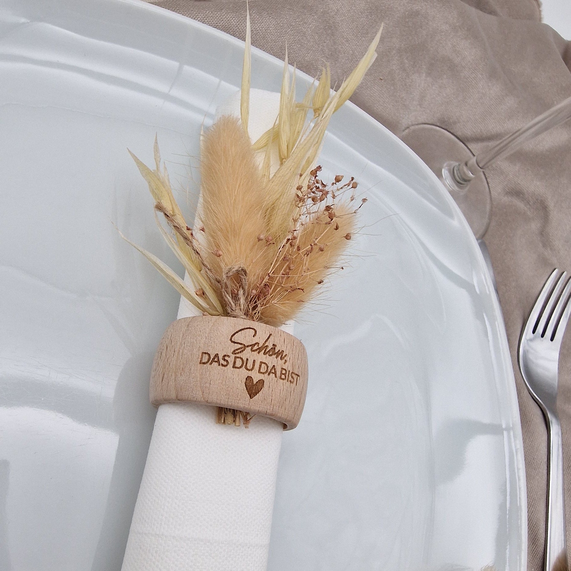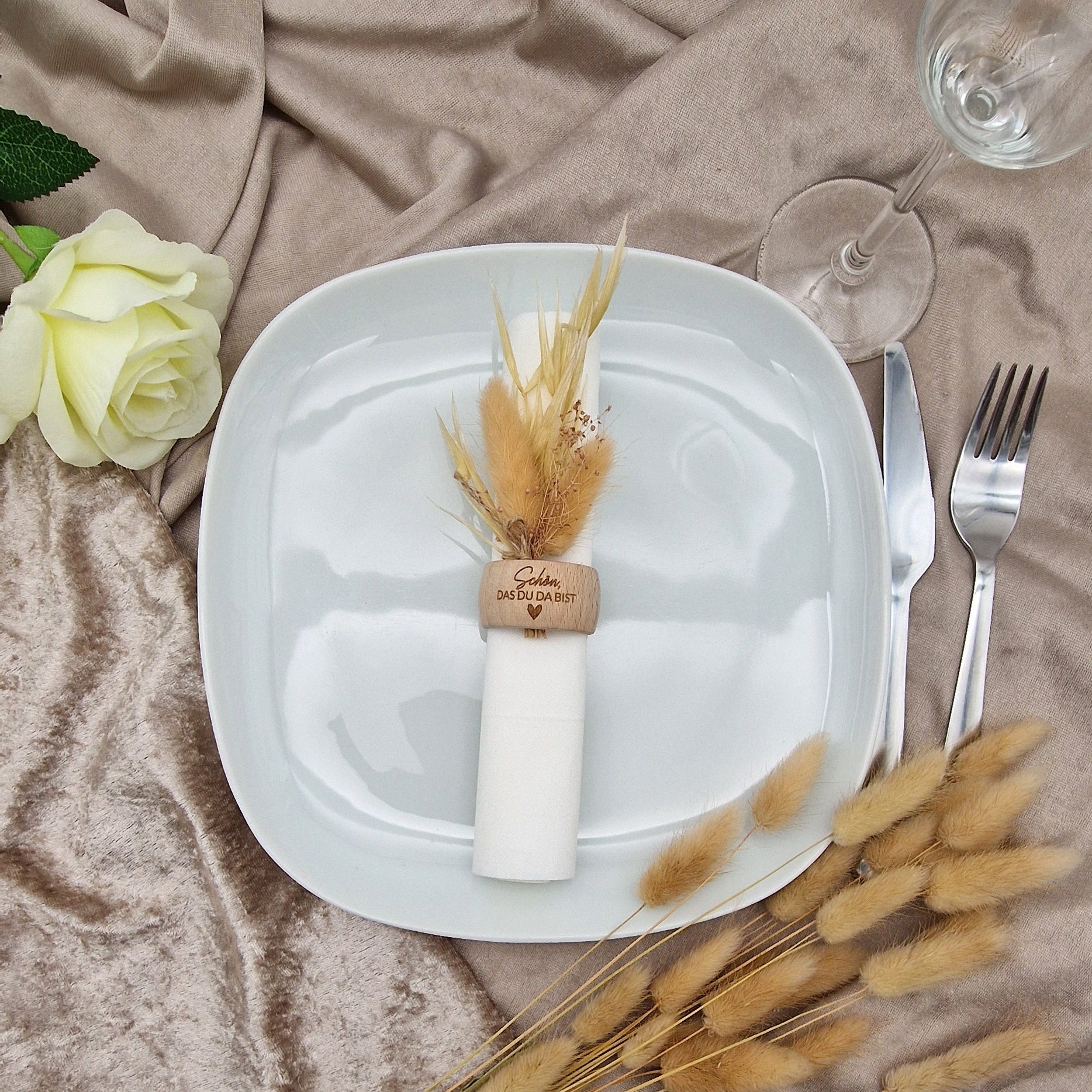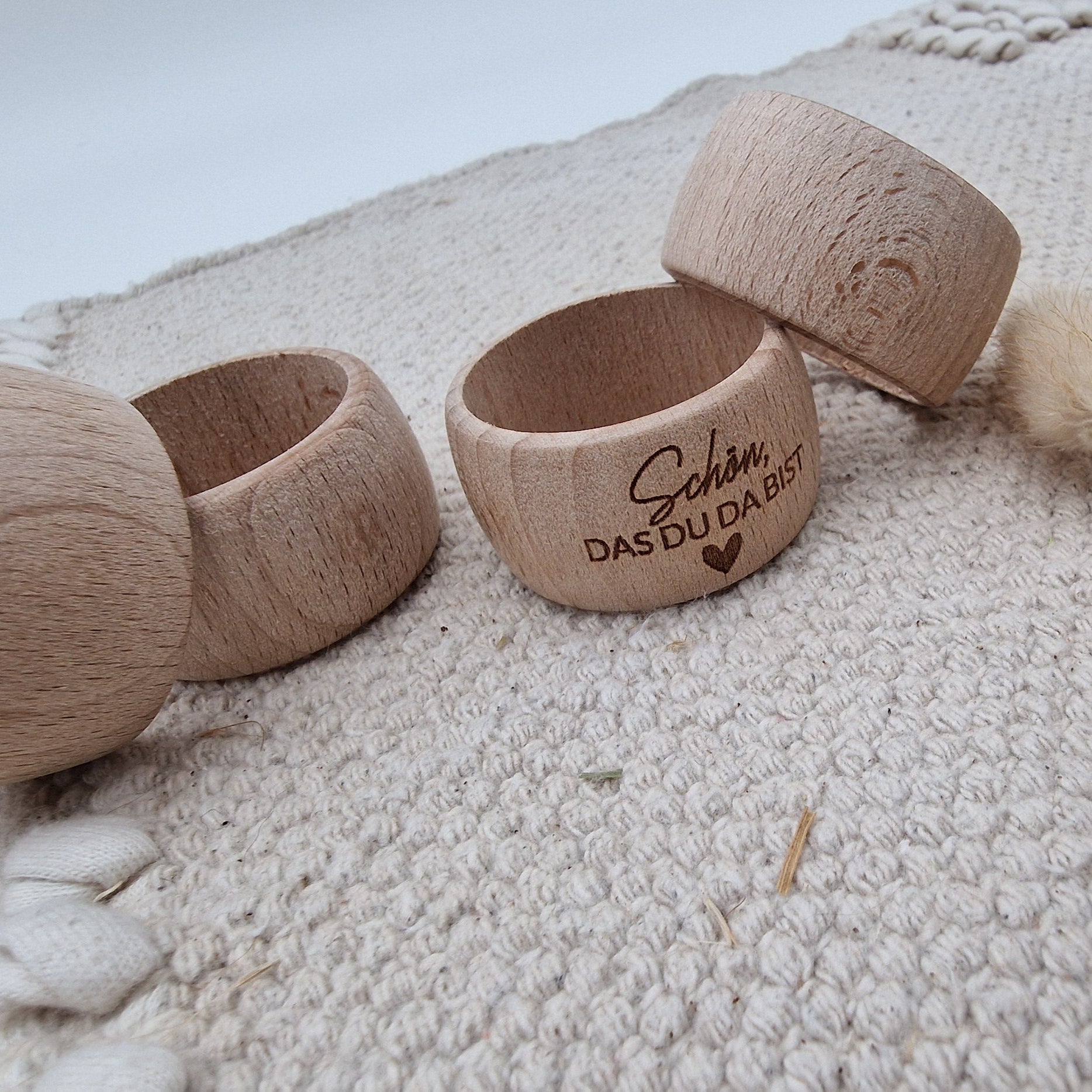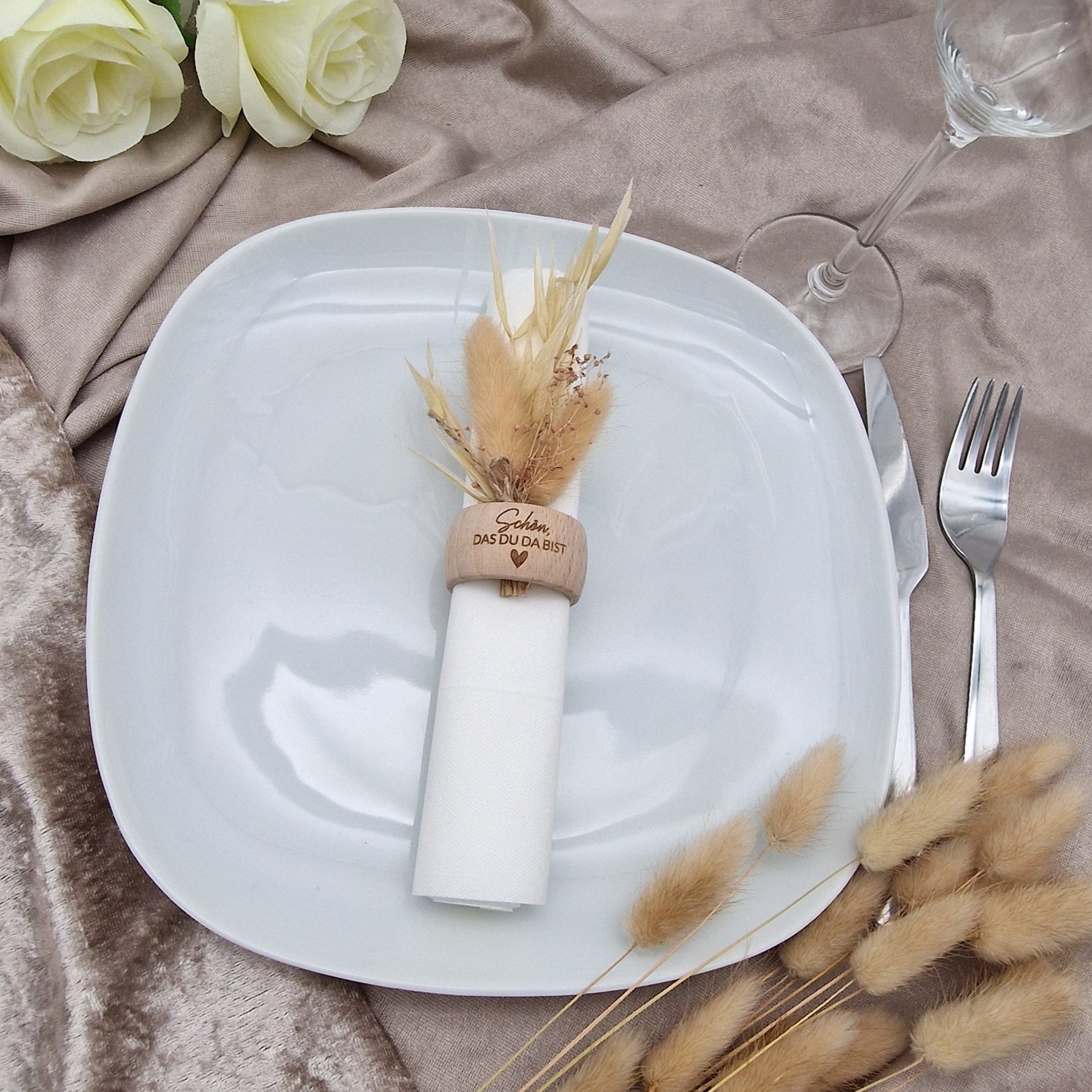 Bringen Sie natürlichen Charme und eine persönliche Note auf Ihren Esstisch! Dieser Serviettenring aus hochwertigem, nachhaltig gewonnenem Holz ist sorgfältig geschliffen und mit einem liebevollen Spruch graviert. Die warme Holzmaserung macht jedes Stück zu einem Unikat. Ideal für festliche Anlässe, Hochzeiten, Geburtstage oder als liebevolles Geschenk für Gastgeber.